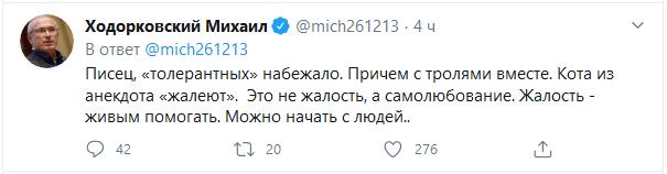 Многие в комментариях терялись в догадках: под действием каких препаратов или напитков Михаил Борисович мог написать такой мерзкий анекдот. Но дело в том, что пост – не совершенная по глупости ошибка. Все его дальнейшие комментарии и очередные похабные анекдоты в ответах это подтверждают. Это не «мерзость», а сама сущность Ходорковского.